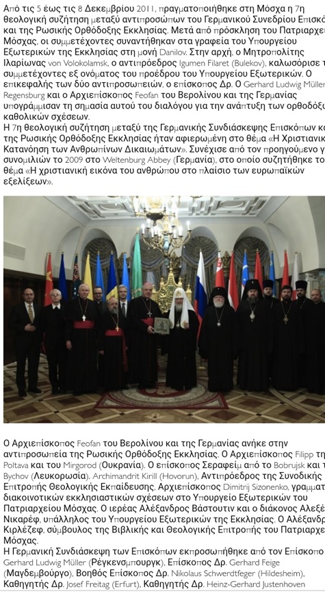 Με αντιπροσωπεία της Γερμανικής Συνόδου Επισκοπών (DBK), ο Επικεφαλής Επίσκοπος Gerhard Feige επισκέφθηκε τους εκπροσώπους της Ρωσικής Ορθόδοξης Εκκλησίας στη Μόσχα στα τέλη Νοεμβρίου ως πρόεδρος της ομάδας εργασίας Εκκλησίες της Ανατολής του DBK. Η αντιπροσωπεία, με επικεφαλής τον επίσκοπο Gerhard Ludwig Müller του Ρέγκενσμπουργκ, πρόεδρος της οικουμενικής επιτροπής, έγινε δεκτός από τον μητροπολίτη Kirill von Smolensk και το Καλίνινγκραντ, επικεφαλής του Υπουργείου Εξωτερικών του Πατριαρχείου Μόσχας. Στη συνομιλία, η οποία διήρκεσε αρκετές ώρες, επιβεβαιώθηκε το αμοιβαίο ενδιαφέρον για εμβάθυνση και συγκεκριμενοποίηση οικουμενικών ζητημάτων μεταξύ της Γερμανικής Συνδιάσκεψης Επισκόπων και της Ρωσικής Ορθόδοξης Εκκλησίας».