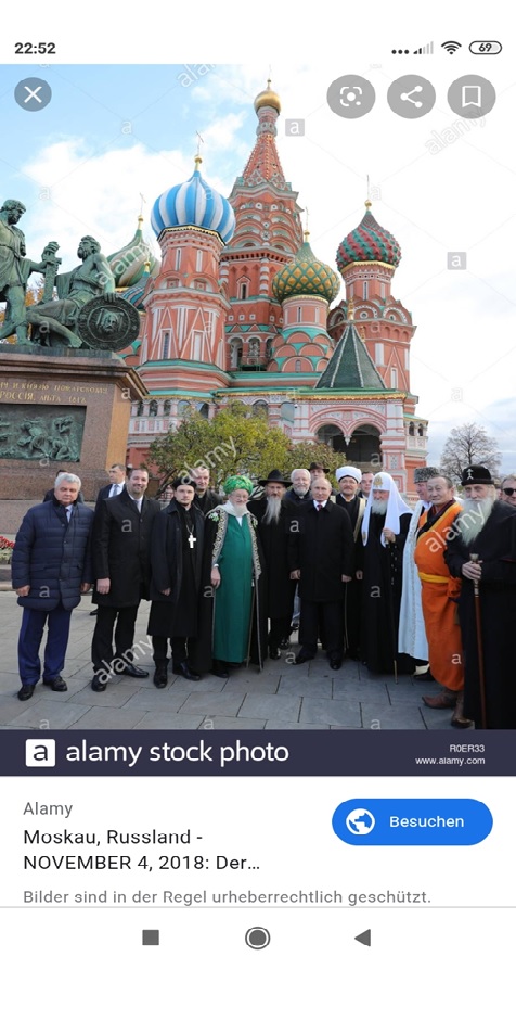 Στὴν δεύτερη φωτογραφία βλέπουμε τὸν Κύριλλο πάλι πρὶν ἀπὸ ἕναν χρόνο, ἄρα δὲν ἀποτελεῖ αὐτὸ σύμπτωση, νὰ συνδιαλέγεται σὲ συνέδρια γιὰ τὴν εἰρήνη τῶν θρησκειῶν καὶ τὴν συνύπαρξή τους ἐν οἰκουμενιστικὴ ἀγάπη. Στὴν φωτογραφία ποὺ ἀκολουθεῖ παρουσιάζεται ὁ «ὀρθόδοξος» Κύριλλος ἀνάμεσα σὲ ρώσους ραββίνους, βουδιστές, μουφτῆδες, εἰδωλολάτρες καὶ σχισματικοὺς ρώσους παλαιοημερολογίτες. Καὶ αὐτὰ συμβαίνουν ὑπὸ τὴν παρουσία/προστασία τοῦ Ποῦτιν, ποὺ ἀπὸ τοὺς δικούς μας παρουσιάζεται ὡς ἐχθρὸς τῆς παγκοσμιοποίησης. Πῶς μπορεῖ αὐτὸ νὰ χαρακτηρισθεῖ; Ἐξ ἀνάγκης διπλωματία;