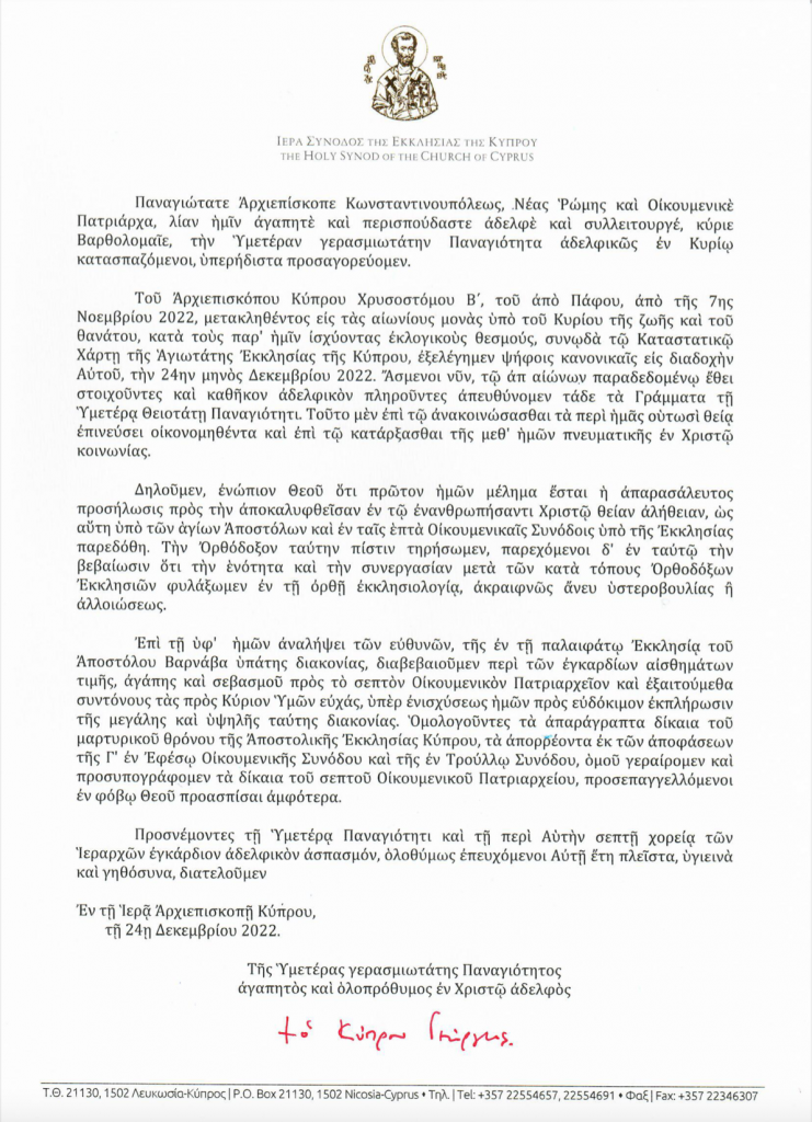 Την απαντητική επιστολή έστειλε ο Κύπρου κ. Γεώργιος, στις 24 Δεκεμβρίου 2022 λίγες ώρες μετά την επιστολή του Προκαθημένου της Ορθοδοξίας.