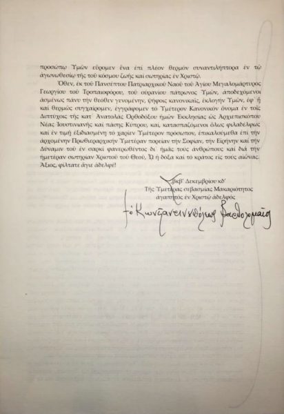 Νωρίτερα, στην συγχαρητήρια επιστολή του ο Οικουμενικός Πατριάρχης κ.κ. Βαρθολομαίος προς τον εψηφισμένο Αρχιεπίσκοπο Κύπρου κ. Γεώργιο εξέφρασε τη βαθιά του συγκίνηση και χαρά για την εκλογή του στον θρόνο της Αρχιεπισκοπής Κύπρου.
