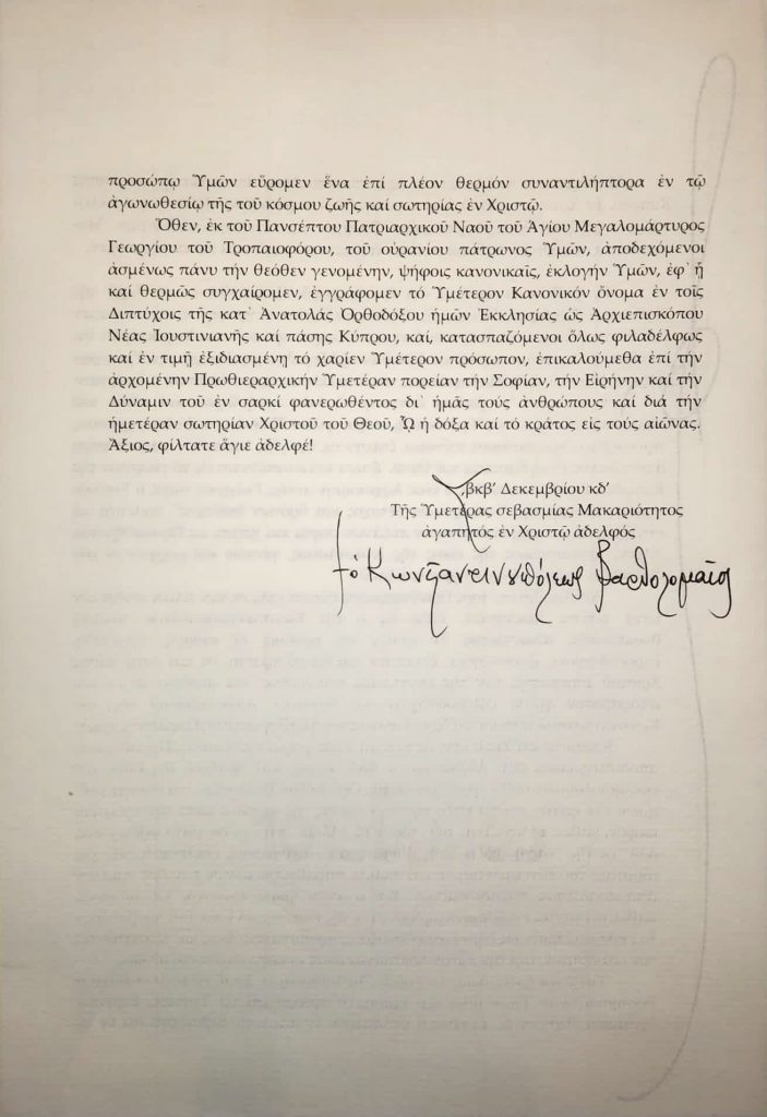Διαβεβαίωση ότι θα στηρίζει το Οικουμενικό Πατριαρχείο δίνει ο νέος Αρχιεπίσκοπος Κύπρου – Οι επιστολές που αντήλλαξαν