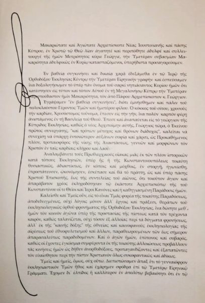 Καλεί μάλιστα τον νέο Αρχιεπίσκοπο Κύπρου με έργα και όχι μόνο με λόγια να προστατεύσει το Ορθό δόγμα της Εκκλησίας και να συστρατευτεί μαζί του στον αγώνα για την προστασία της πίστεως – όχι τόσο από τα άλλα δόγματα – όπως αναφέρει χαρακτηριστικά  αλλά από την καινοφανή αίρεση του εθνοφυλετισμού  και την προσπάθεια αλλοίωσης της Ορθοδοξίας από εγκόσμια τα συμφέροντα.