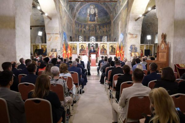 «Έτσι γεννήθηκε η Αγία μας Ορθόδοξη Μακεδονική Εκκλησία, με προαιώνια συνέχεια, της οποίας τα άμεσα θεμέλια είναι η Αγία Αρχιεπισκοπή Αχρίδος, η οποία ταυτίζεται με την πρώην Αρχιεπισκοπή Πρώτης Ιουστινιανής. Και αυτή η ομιλία μου και αυτή η εκδήλωση λαμβάνουν χώρα στον ναό της Αγίας Σοφίας, που ήταν και ο ιστορικός Καθεδρικός Ναός της διαλαμψάσης Αρχιεπισκοπής Αχρίδος, και ακριβώς ανάμεσα σε αυτούς τους τοίχους και τις τοιχογραφίες δοξάστηκε ο Θεός για αιώνες, αλλά γεννήθηκε και καλλιεργήθηκε και ο πολιτισμός μας, η ταυτότητά μας και η ύπαρξή μας. Και γι’ αυτό η Ορθόδοξη Μακεδονική Εκκλησία μας είναι ένας από τους ισχυρότερους πυλώνες του λαού μας. Είναι η μητέρα της πνευματικής μας ανάπτυξης διαμέσου των αιώνων, το καταφύγιό μας και η ισχυρότερη απόδειξη της ύπαρξής μας. Κάθε πλήγμα στην Εκκλησία μας είναι πλήγμα για τη Μακεδονία, για την ύπαρξη και την ζωή μας. Ο καθένας μας οφείλει να προστατεύει την Εκκλησία, να τη σέβεται και να αγωνίζεται να προσφέρει με ενότητα και γνώση όσο το δυνατόν περισσότερο σε ζητήματα σημαντικά για το μέλλον μας. Και αυτή η συμπεριφορά θα πρέπει να είναι η ίδια για όσους βρίσκονται τόσο στις τάξεις της όσο και εκτός αυτής», ανέφερε μεταξύ άλλων.